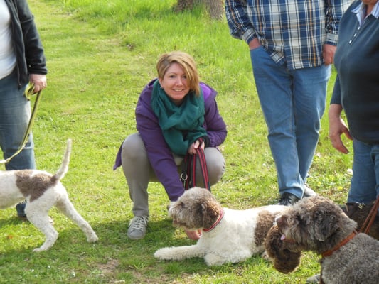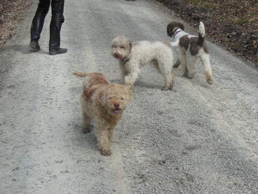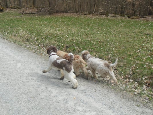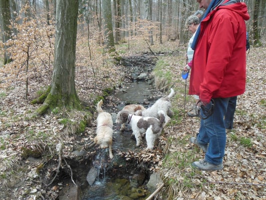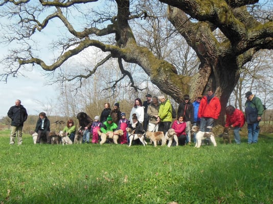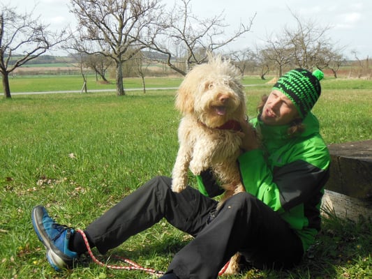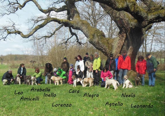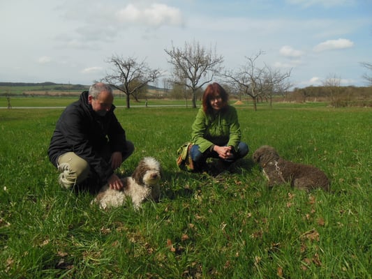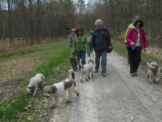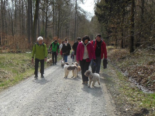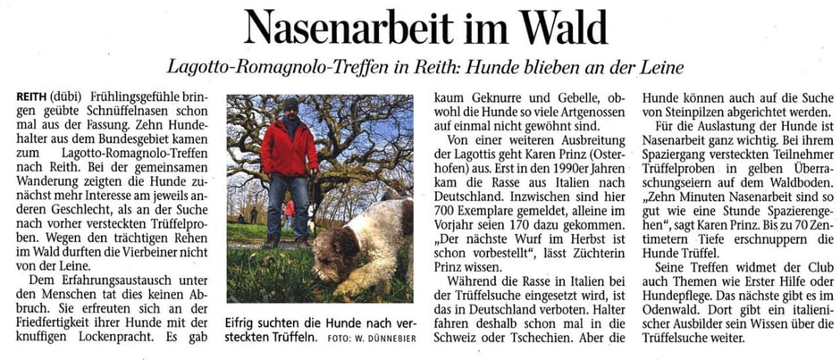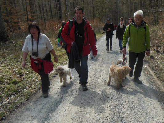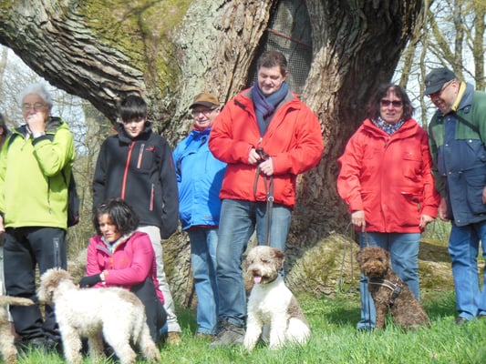 Zusammen ging es dann los zu einem 11 km langen Spaziergang, vorbei an einer 1000 Jahre alten Eiche. Dort wurden wir von einem Reporter erwartet, der einen Bericht für die Ansässige Mainpostzeitung über den Lagotto schreiben wollte.