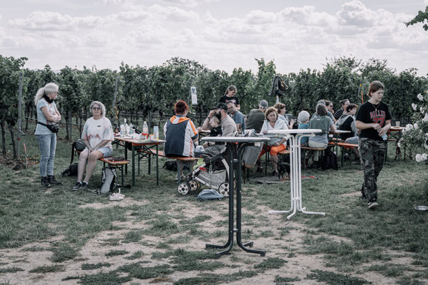 Weiter ging es durch die Weinreben hinauf zur Wengertshütte, wo unsere fleißigen Helfer bereits Vorbereitungen zum Rasten getroffen hatten. Die Bierzeltgarnituren waren schon aufgebaut und mit den mitgebrachten Speisen, Salaten und Kuchen entstand ein leckeres Buffet.